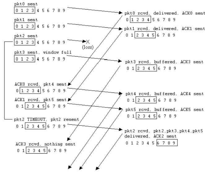 우리가 보낼 패킷은 {0,1,2,3,4,5}이며, N은 4이다. 아쉽게도 2번 패킷을 전송하는데 실패했다. 그림과 아래의 텍스트를 참고하여 흐름을 따라가보자.