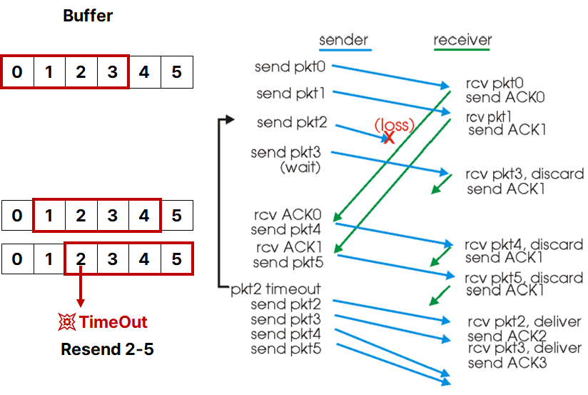 - 송신자 : ACK(2)를 수신하지 못했기에 Timeout이 발생했다. 패킷 {2,3,4,5}를 다시 전송한다.