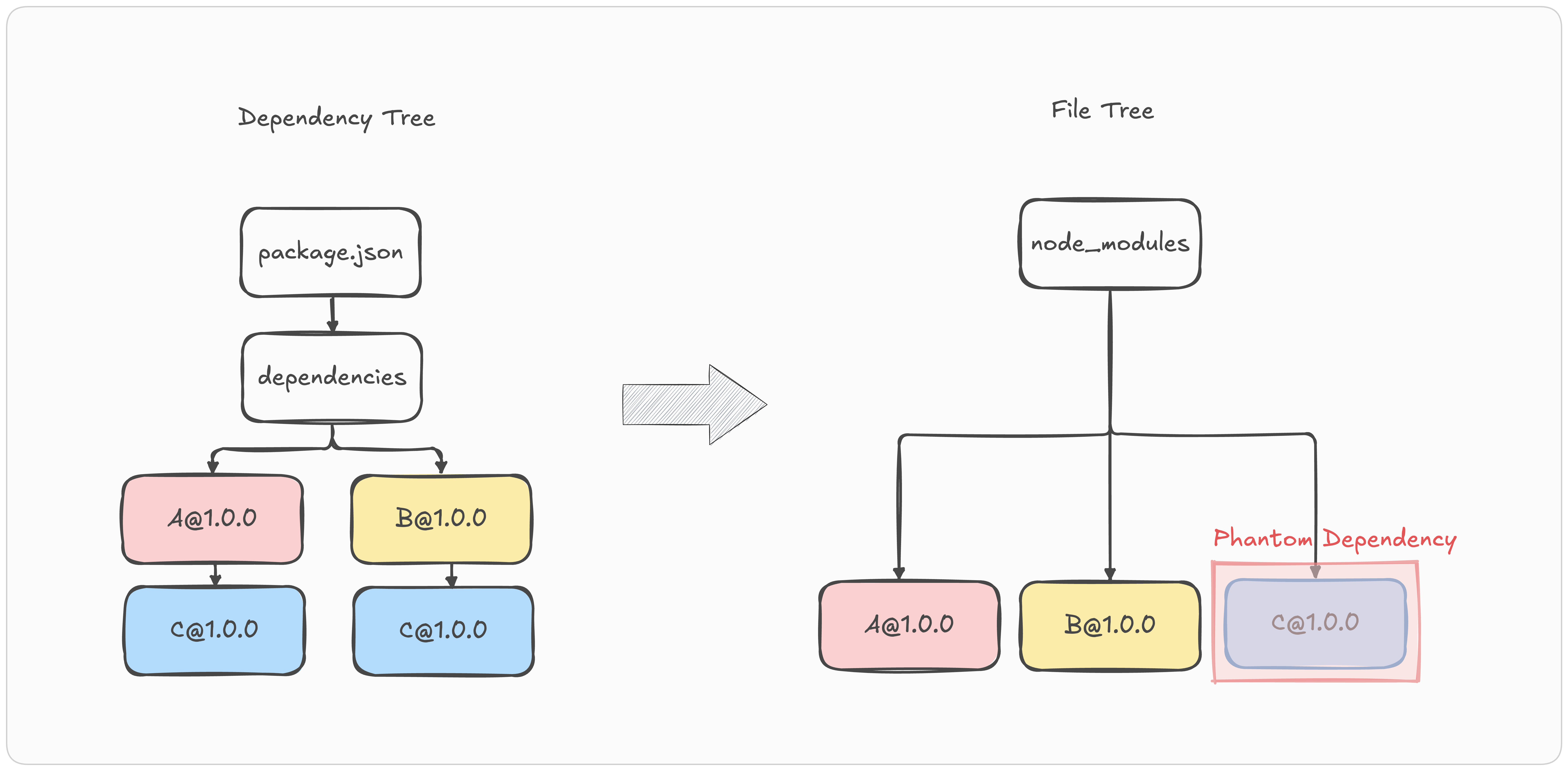 C 패키지는 호이스팅되어 node_modules 하위에 폴더로 존재한다. 그래서 실제 코드에서는 C 패키지를 참조할 수 있다. 이와 같이 dependencies에 없는 패키지를 참조할 수 있는 현상을 유령 의존성(Phantom Dependency)이라고 한다.